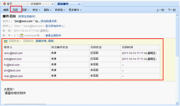 一:本邮箱发送出去的收件人、抄送人或者密送人包括本域邮箱地址的、且有保存在邮箱中的(包括保存在已发邮件夹和其它邮件夹)、并且非在写邮件页面设置了“邮件召回”的邮件在其阅读页面提供【召回】功能。仅尝试发往本域邮箱、本域邮件列表、邮箱别名的邮件,不支持从其他邮箱召回。