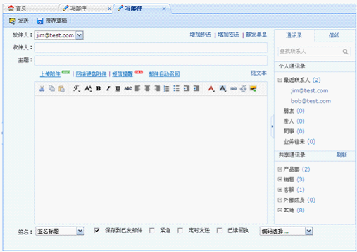 (2)、企业用户绑定了域别名,在该域别名解析生效后,在浏览器地址栏输入mail.域别名进入邮箱登录页面,使用域别名邮箱地址和密码即可登录该域别名邮箱,用域别名邮箱发送邮件,发件人显示该域别名邮箱。