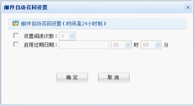 弹出邮件自动召回设置窗口,进行相应的自动召回设置,可选择设置自动召回"启用过期日期"、"设定阅读次数",二者至少设置一项时即为自动召回邮件,并自动保存至【自动召回邮件】邮件箱: