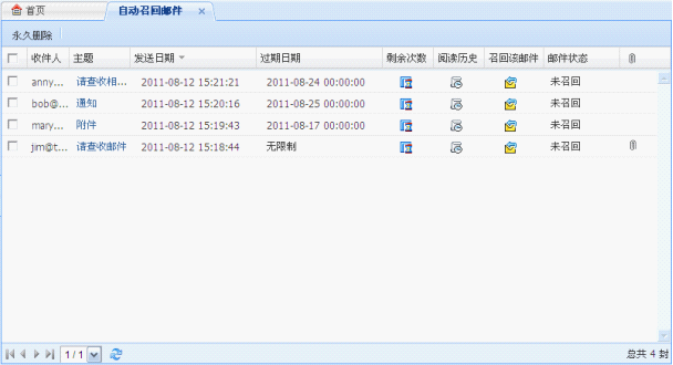 在【自动召回邮件】邮件箱可以查看原邮件、该邮件的剩余阅读次数、阅读历史,并提供对未召回邮件的【召回】操作: