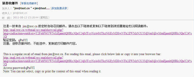 收件人阅读自动召回邮件时显示链接,点击链接及输入相关验证密码后才可以查看邮件: