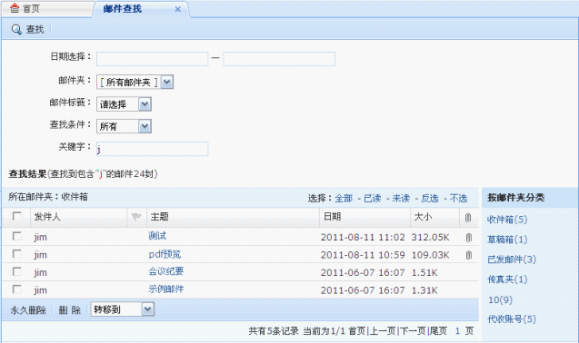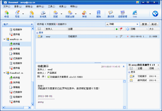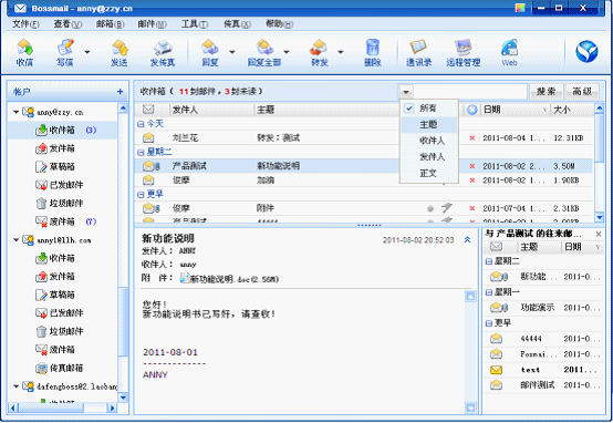 1、快速搜索邮件全文。不仅可通过姓名、主题来查询,还可以输入正文中的关键词来查询。查询结果快速显示。
