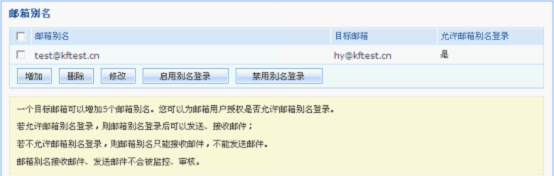 A: (1)、可设置是否允许邮箱别名登录;如选择“是”,则该用户可以使用邮箱别名登录发送邮件,发件人显示该邮箱别名;如选择“否”则不能使用邮箱别名发送邮件;邮箱别名接收邮件不受限制。