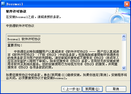 双击下载的安装包,在出现的“安装向导”中点击“下一步”进入《Bossmail软件许可协议》。