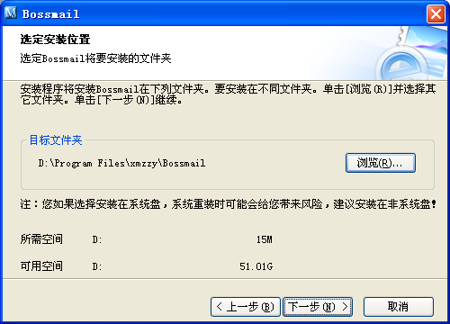 在此界面点击"下一步"在默认目录安装Bossmail或点击"浏览"选择您的Bossmail安装目录。