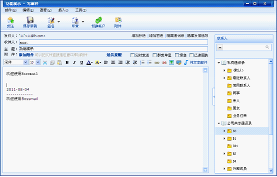 A: 登录BossmailM首页,点击“写信”进入写邮件界面。