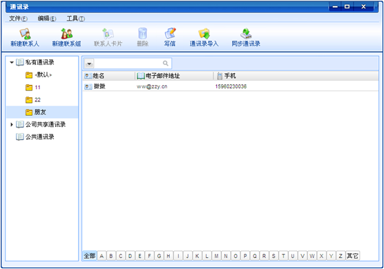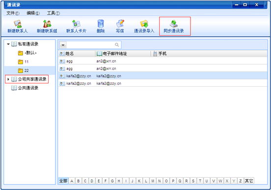 选择"私有通讯录"或"公共通讯录",点击"新建联系组"打开新建分组界面,我司邮箱帐号可同步Web端共享通讯录。