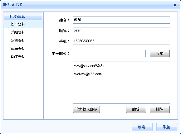在联系人卡片中填写联系人相关信息,包括姓名、邮箱等。点击"确定"添加成功。