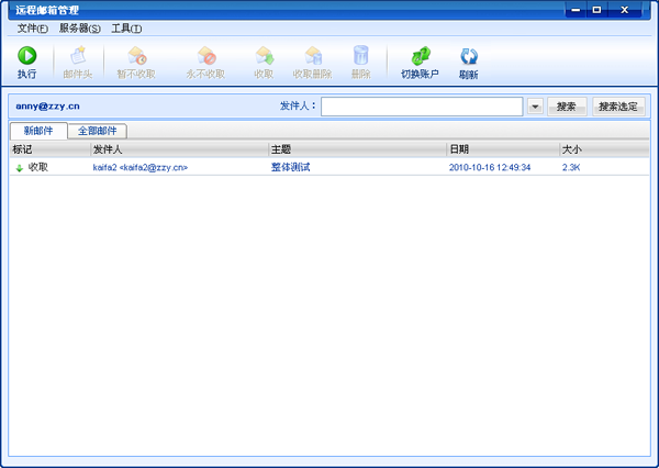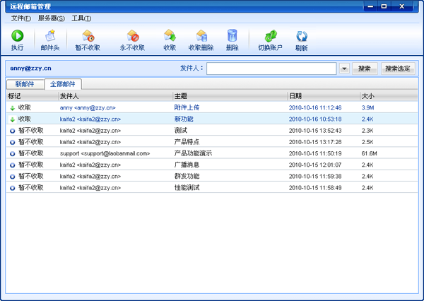 点击新邮件将收取服务器上新邮件信息,点击全部邮件将收取服务器上的所有邮件的邮件信息,选择邮件,点击"暂不收取"或永不收取等操作按钮。