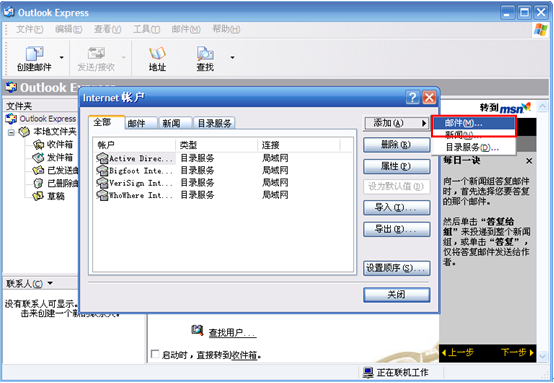 A: 第一步:【工具】=>【帐户】=>【添加】=>【邮件】