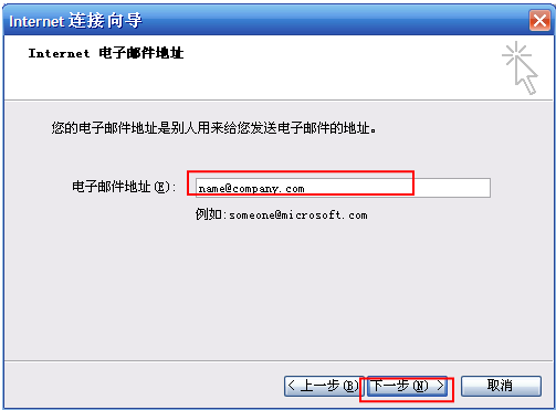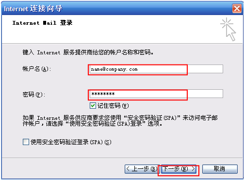 邮件帐户:name@company.com (重要提示:@后面一定要把邮件帐户地址填完整)