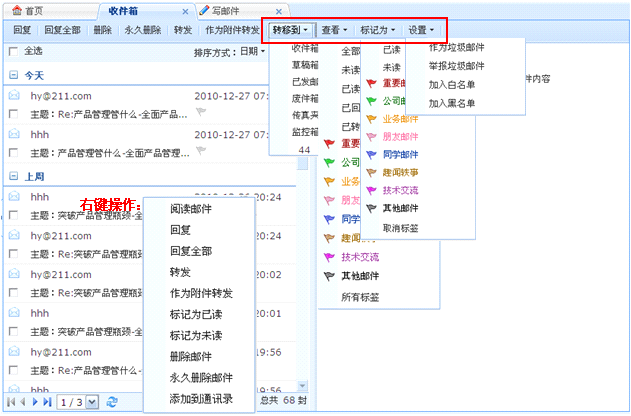 注:对选中的邮件,您可以进行删除、永久删除、作为附件转发、转移到、查看、标记、设置等处理操作。