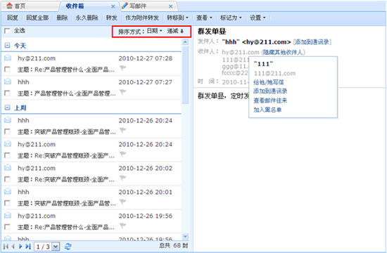 A: 在您进入邮箱查看邮件列表时,在排序方式处可以选择排序的。默认情况下的排序方式是按日期降序排列。在排序方式下拉框可以选择按日期/发件人/主题,升序/降序排列: